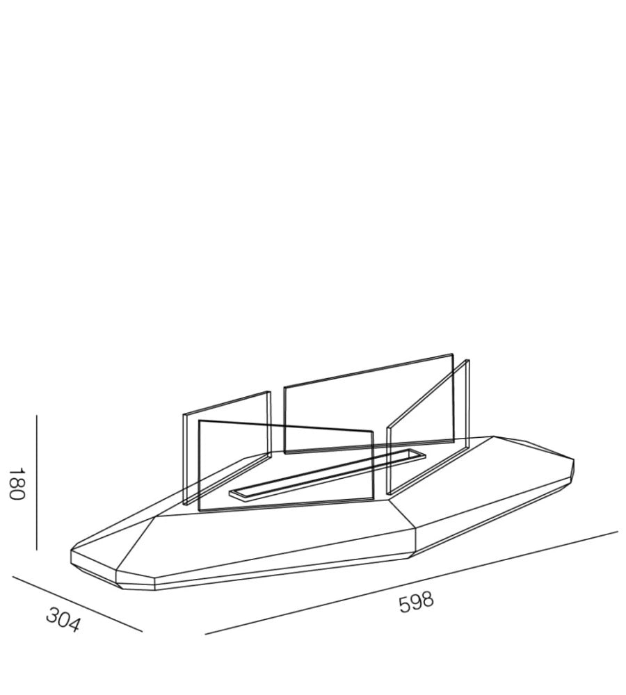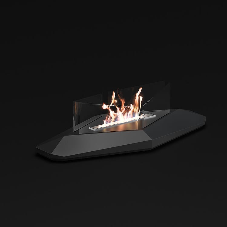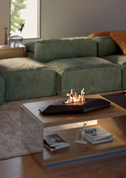 Biocamino da tavolo. Struttura in acciaio verniciato e vetro. Bruciatore removibile con fibra e coperchio di chiusura fiamma.