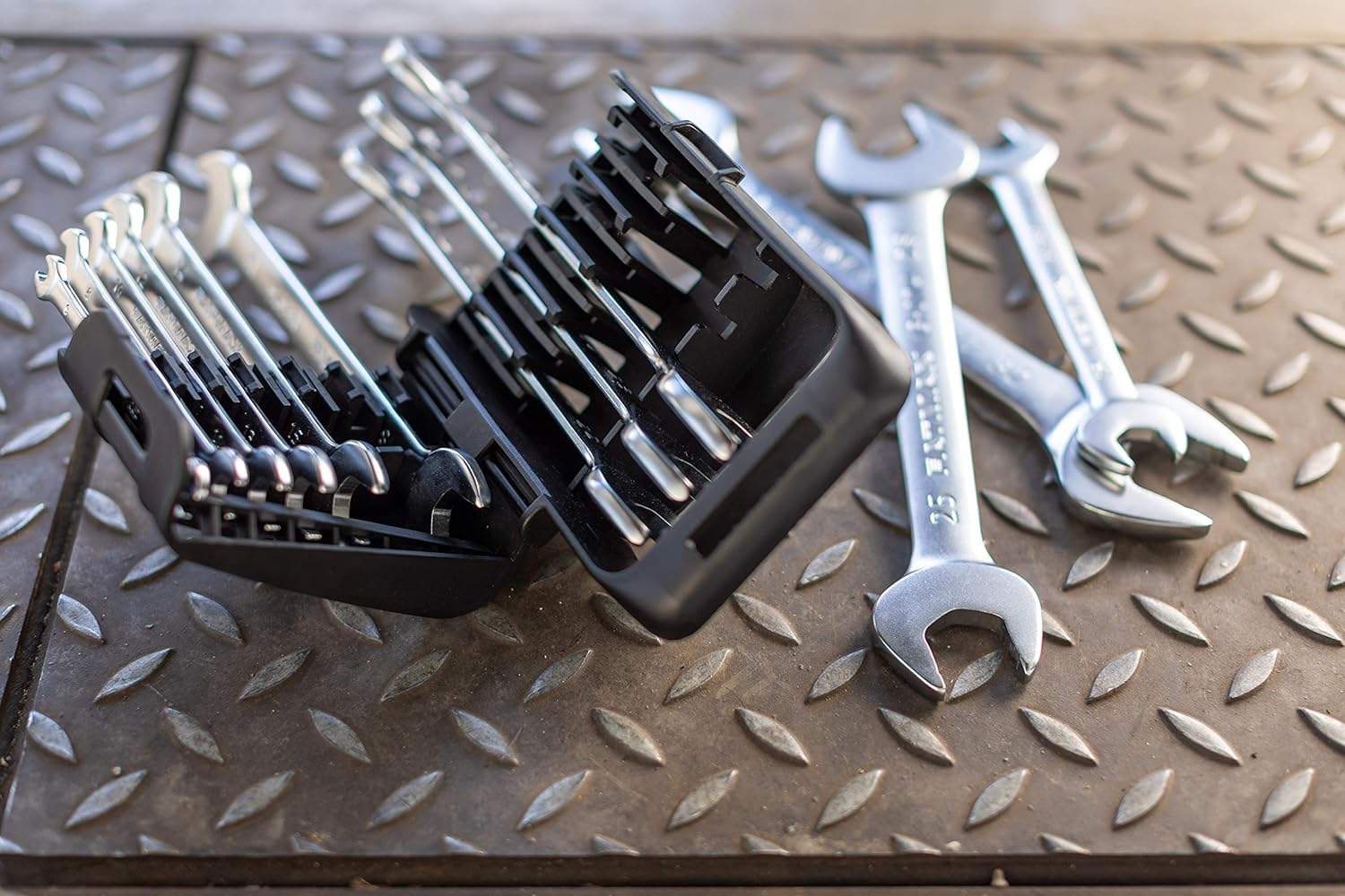 Set 12 chiavi a forchetta doppia; con configurazione anti scivolo della bocca; finitura cromata satinata; misure mm 6x7 - 8x9 - 10x11 - 12x13 - 14x15 - 16x17 - 18x19 - 20x22 - 21x23 - 24x26 - 25x28 - 30x32; con supporto in materiale sintetico.