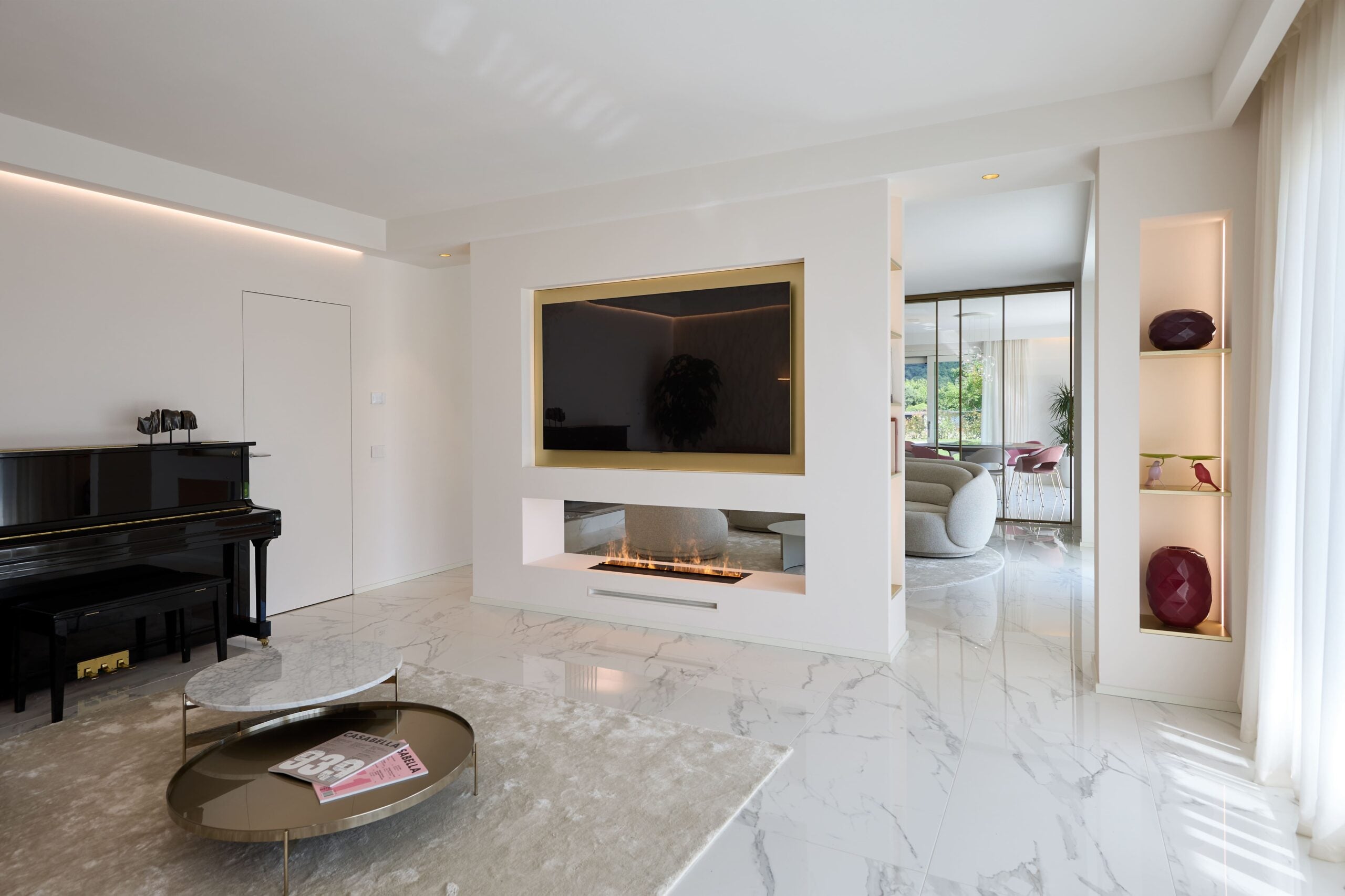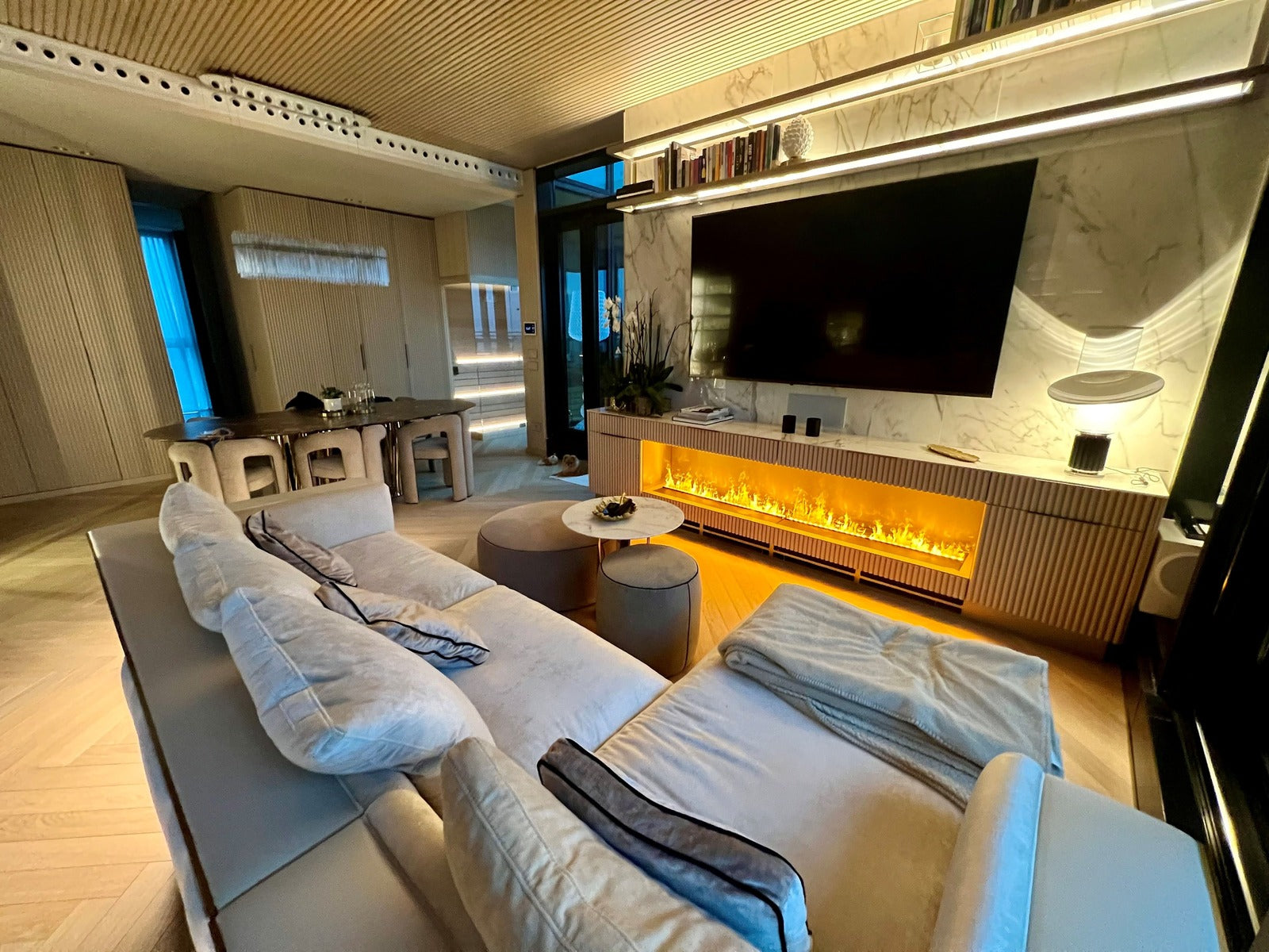 Posizionabili anche in linea e connessi con bluetooth per creare fronti di fuoco di varie metrature, si incassano liberamente negli arredi di qualsiasi materiale.