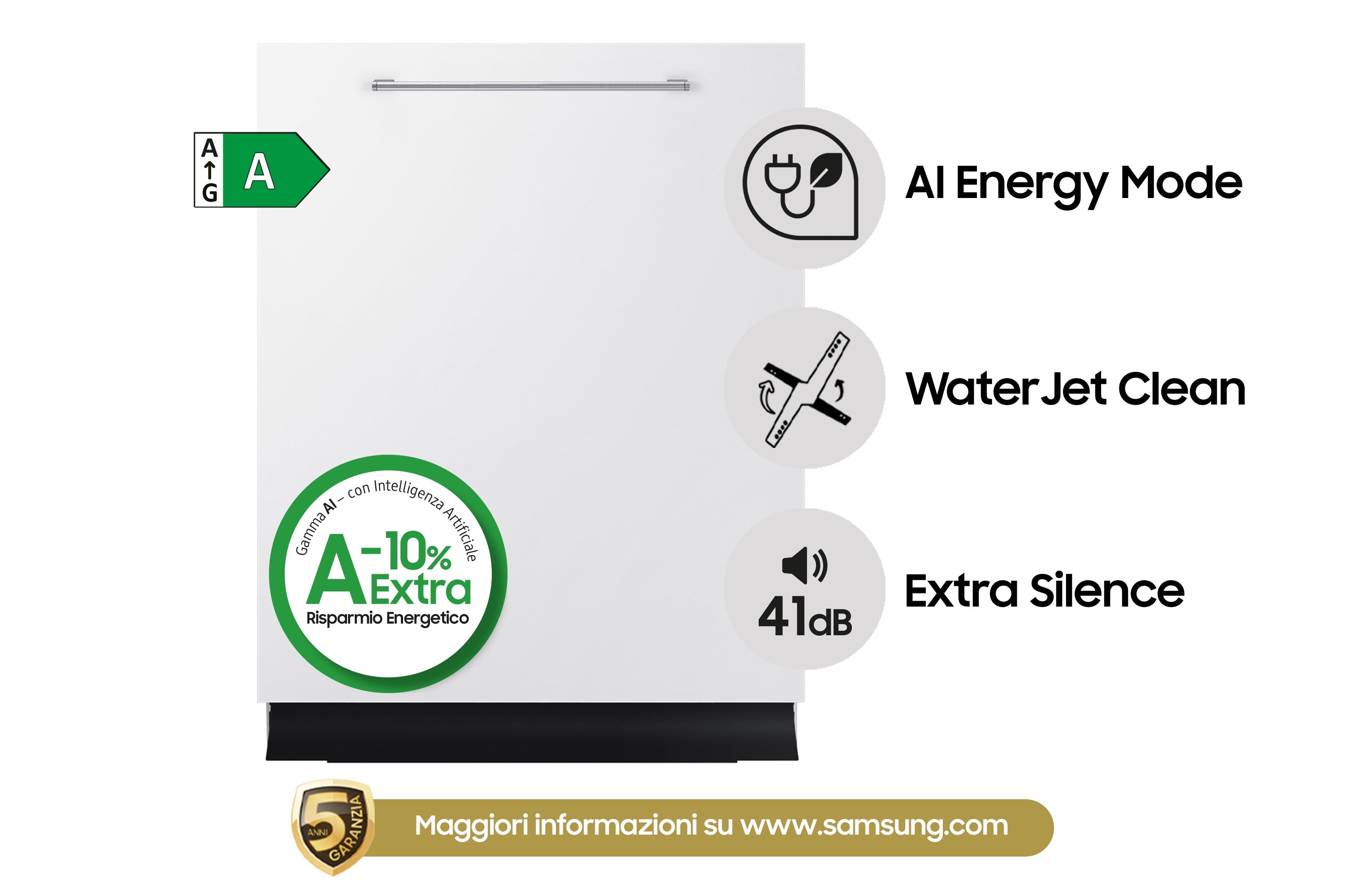 Per una casa più silenziosa. La lavastoviglie funziona in modo più fluido e silenzioso grazie al motore Inverter. Dispone inoltre di un programma Extra Silence che lava un po' più lentamente, ma produce 2 decibel in meno di rumore rispetto al programma ECO. Il rumore emesso è addirittura inferiore a quello di una biblioteca.