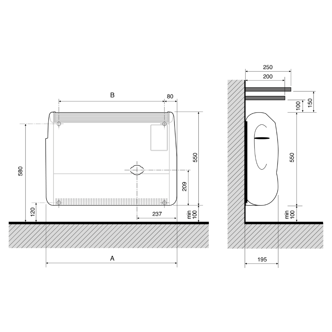 • Deve essere rispettata la corretta distanza dagli altri elementi circostanti come riportato di seguito: