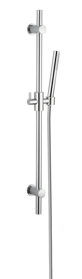 Set saliscendi doccia composto da asta 208 ottone cromato Ø 20 mm, doccia Atena in ABS cromato con anticalcare 1 getto e flessibile 150 cm Satilux. Fissaggio a 1 vite per ogni laterale