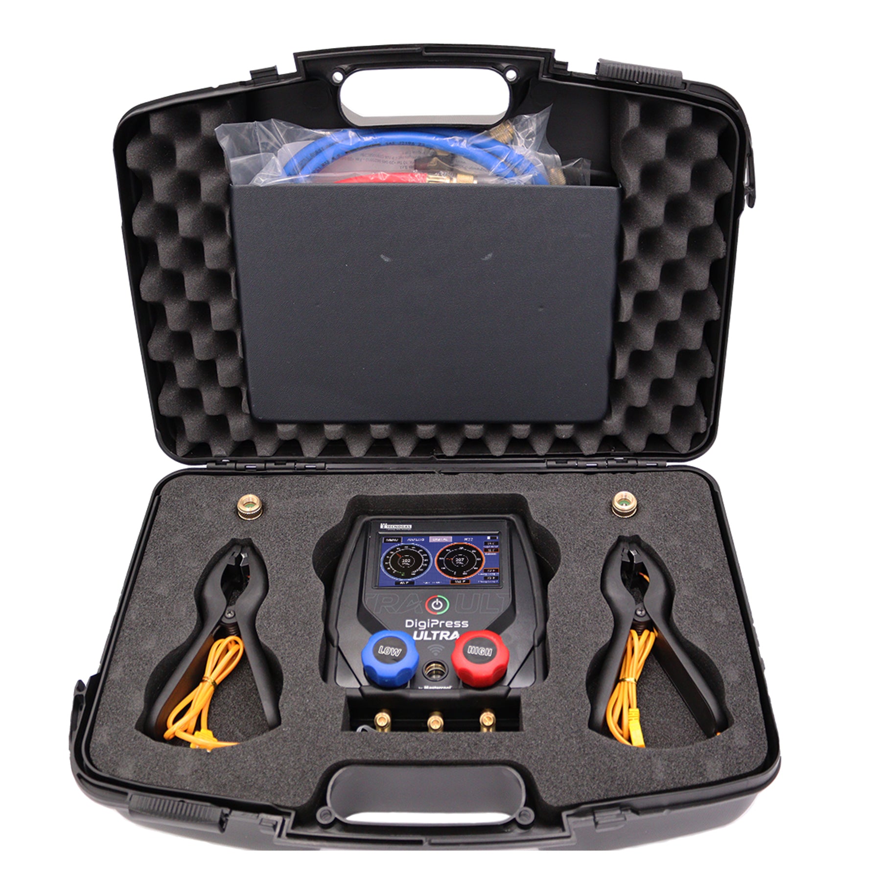 DigiPress ULTRA è l'innovativo manifold digitale intelligente a 2 vie riposto in una robusta e comoda valigia dotato di display LCD touchscreen da 4" e tecnologia Bluetooth®; grazie a questo collettore sarà possibile visualizzare in tempo reale i valori di pressione, vuoto, temperatura, inoltre calcolerà in automatico i valori di surriscaldamento e sotto raffreddamento.