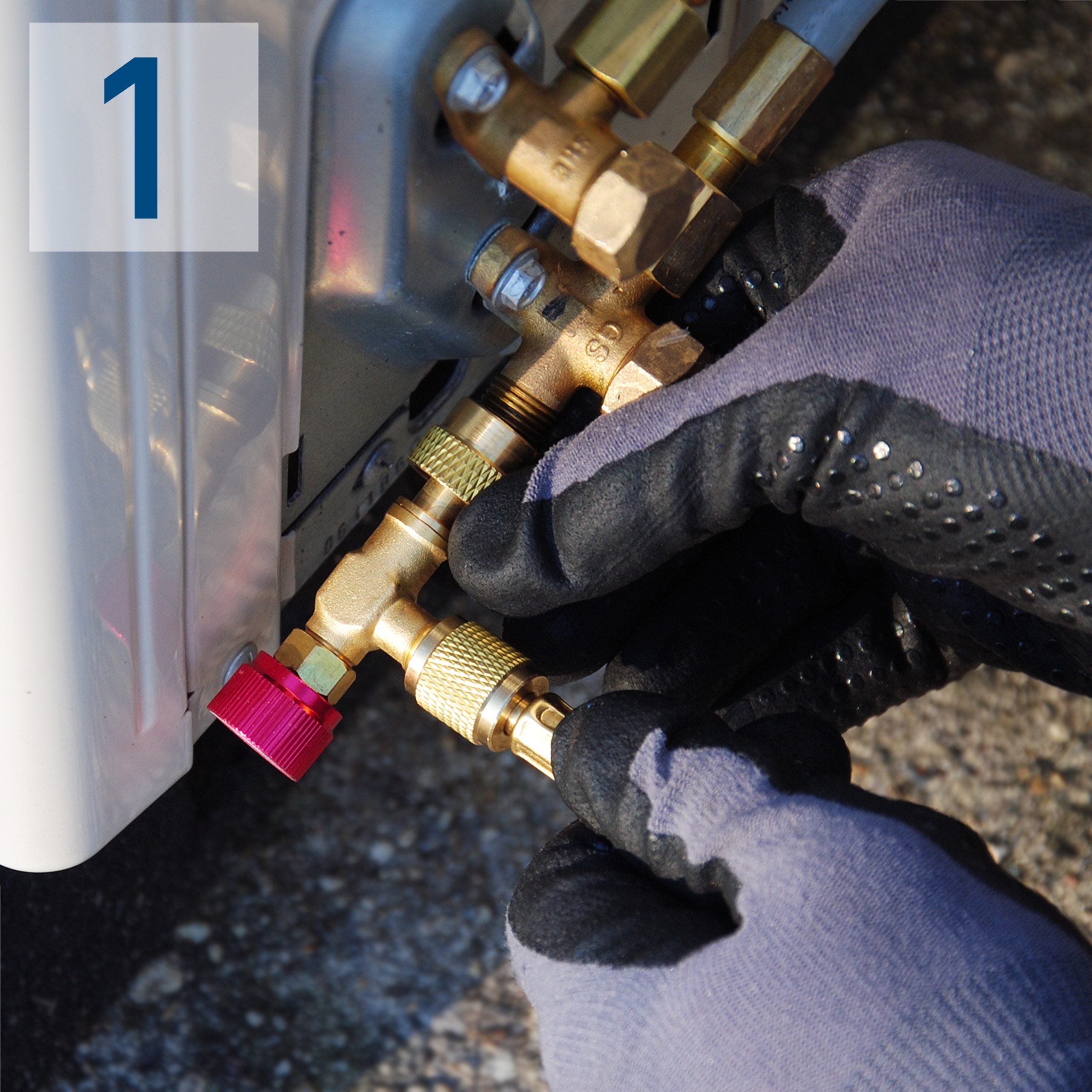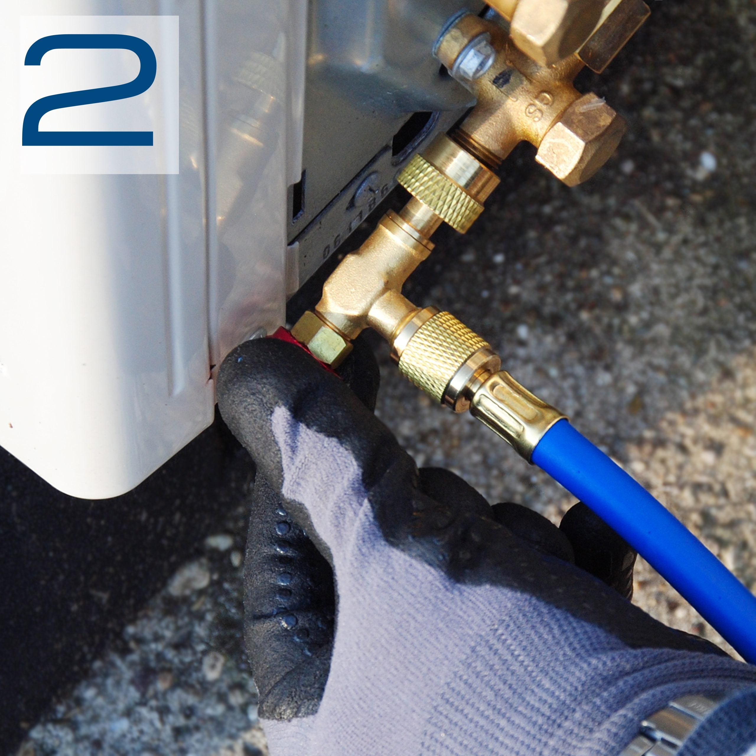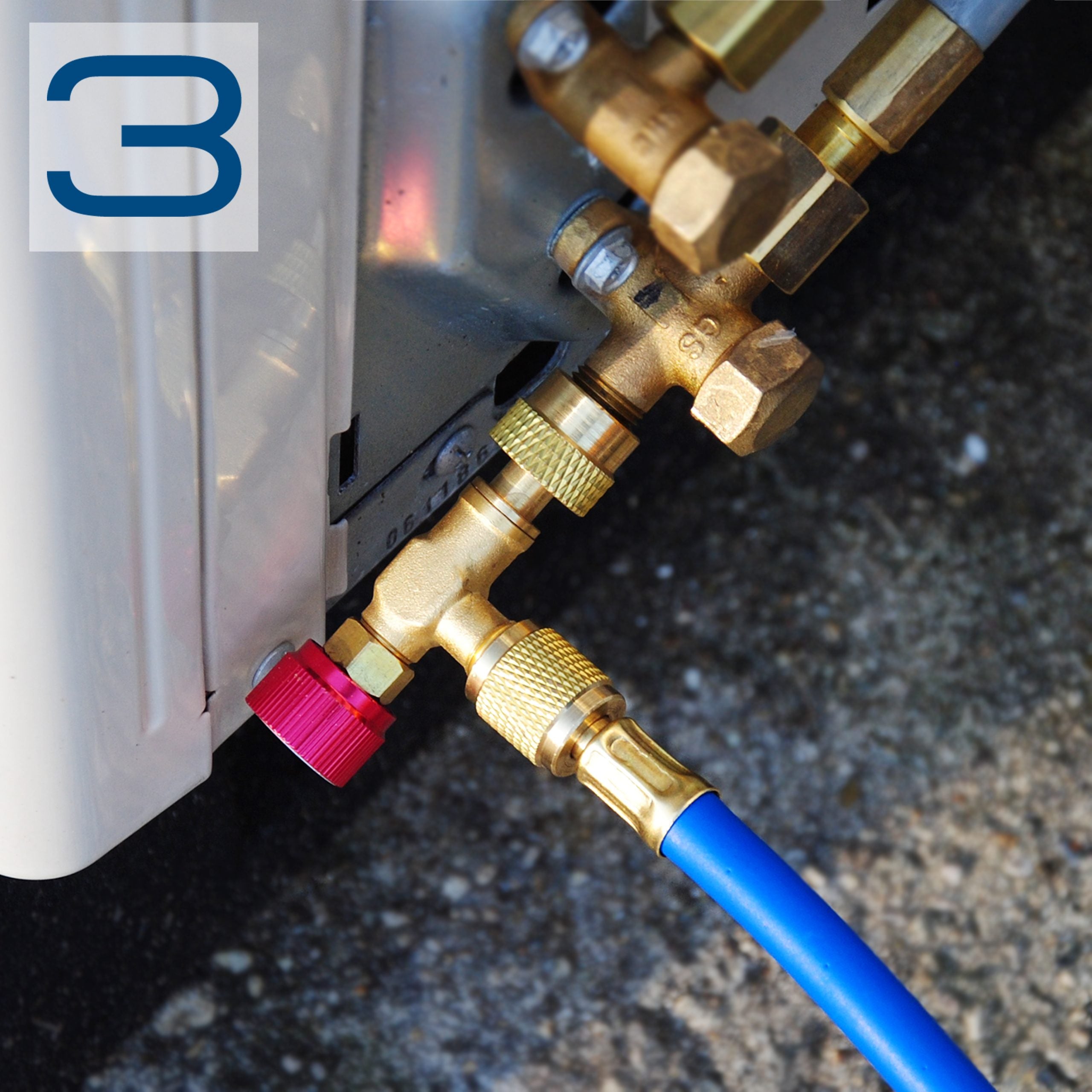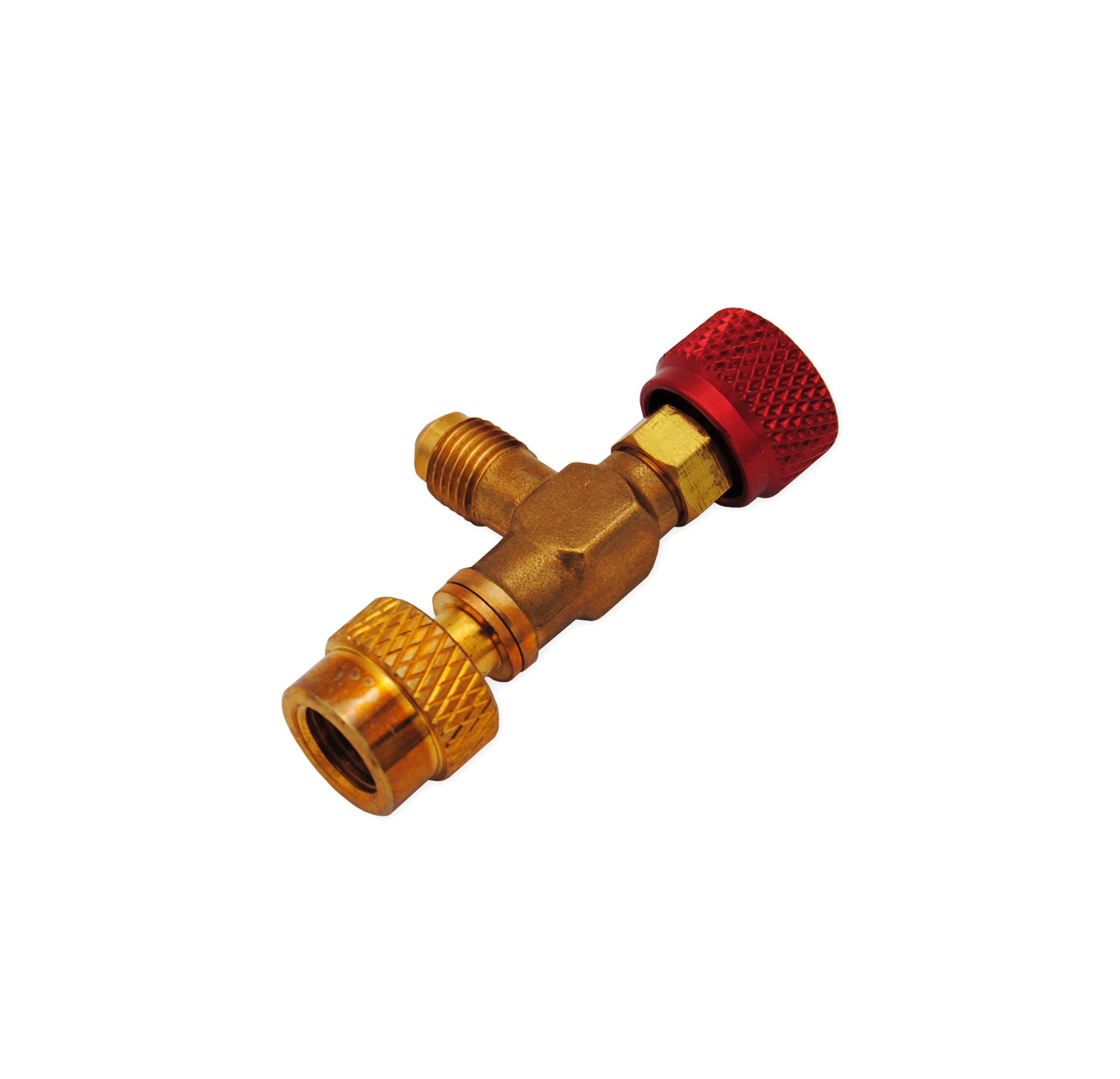 Rubinetto accessorio per manichetta flessibile, che permette il collegamento all'attacco di servizio delle unità esterne senza perdite di gas refrigerante e olio durante le operazioni di aggancio e sgancio.